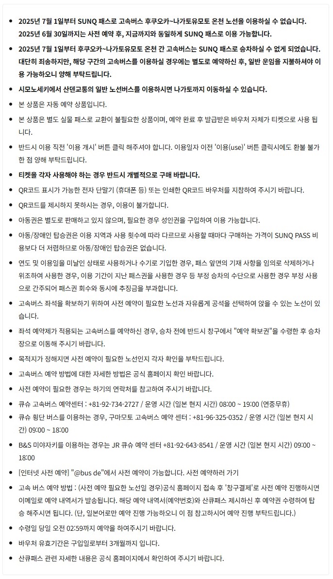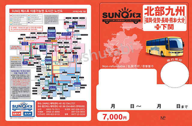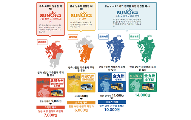 • 이용 가능 지역: 후쿠오카, 사가, 나가사키, 오이타, 구마모토 총 5개 지역+시모노세키 고속버스, 시내 노선버스와 크루즈(5개 항로)