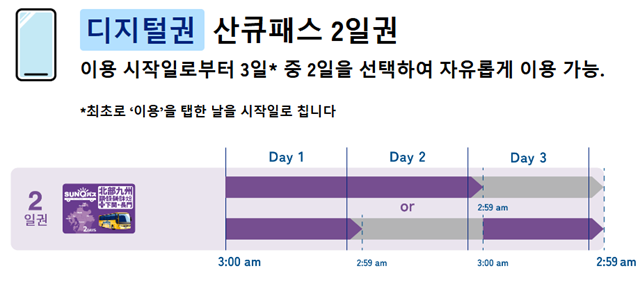 • 예약 시 선택한 개시일 포함한 3일 동안 이용이 가능하며 이용 시간은 03:00-26:59을 1일로 계산되며, 24:00-26:59 승하차 시 전날 사용으로 간주됩니다.
