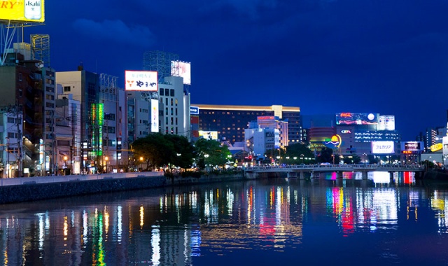 데크 위 의자에 앉아 후쿠오카의 노을 지는 모습을 직접 눈에 담아보세요. 노란색과 선분홍빛을 띄는 아름다운 노을이 강에 비추며 황홀한 풍경이 펼쳐진답니다.