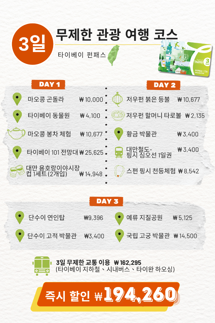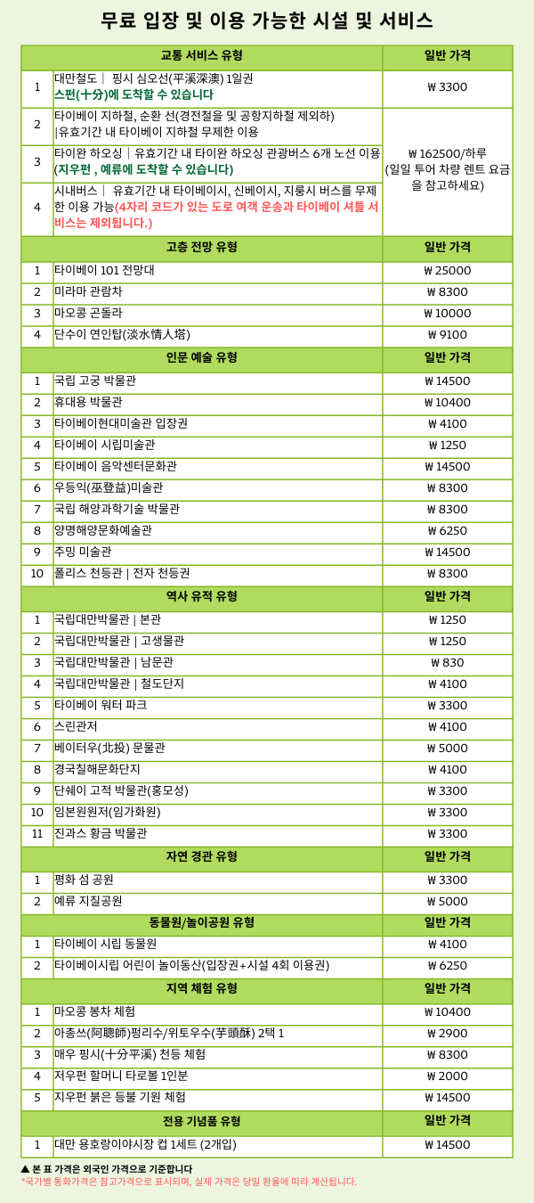 무제한 패스에는 타이베이 및 신타이베이 시영 지하철 (타오위안 지하철 제외)을 무제한으로 이용할 수 있는 혜택이 포함되어 있습니다.
