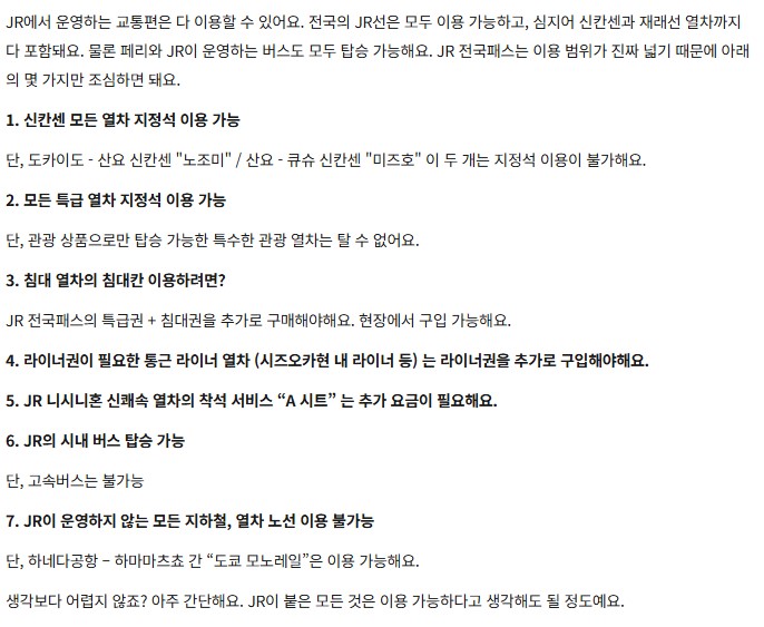 JR전국패스는 JR 신칸센(단, ‘노조미호’, ‘미즈호호’는 제외)・특별급행열차, 보통급행열차, 보통열차 및 BRT(버스 고속수송시스템), 그리고 미야지마~미야지마구치 구간을 운행하는 JR서일본 미야지마 페리, JR홋카이도 버스, JR버스 도호쿠, JR버스 간토, JR도카이 버스, 서일본 JR버스, 주고쿠 JR버스, JR시코쿠 버스, JR규슈 버스 및 도쿄 모노레일을 이용하실 수 있습니다. (JR 버스회사 각사의 고속버스 노선과 일부 버스 노선 구간에서는 승차하실 수 없습니다.)