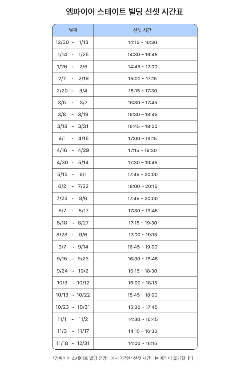 ※ 시즌에 따라 운영 시간이 변동될 수 있습니다. 자세한 사항은 공식 홈페이지를 참고해 주세요.