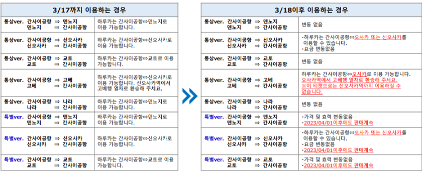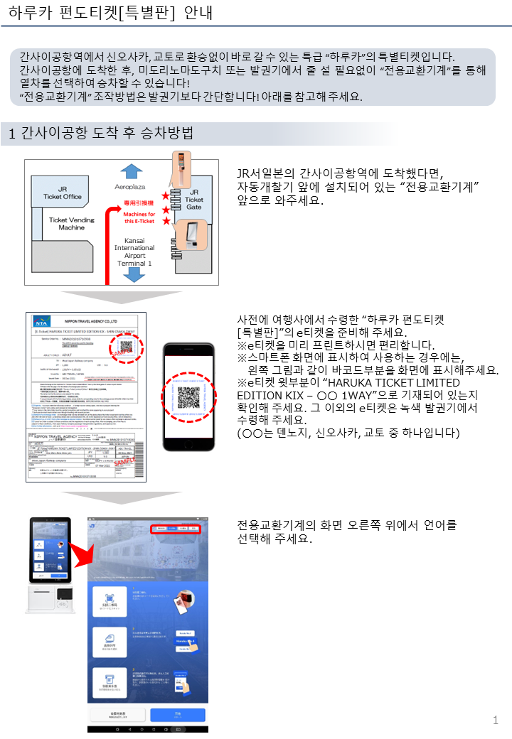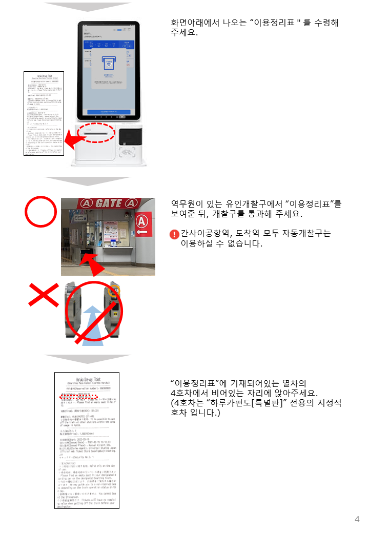 *공항에서 고베, 나라 이동은 중간에 오사카역/덴노지역에서 일반 열차로 갈아타기 때문에 녹색 발권기로 발권한 티켓이 필요해요. 흰색 발권기로는 발권하지 마시기 바랍니다.
