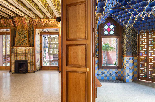 가우디는 까사 비센스를 지을 당시 정원에 있던 금잔화에서 모티프를 얻어 외관에 노란색 꽃 모양 타일을 외벽에 활용했어요. 초록과 흰색을 주로 사용한 내부는 돌과 유리조각으로 만들어진 모자이크 바닥으로 조명에 반사될 때마다 반짝거리는데 이게 가장 큰 특징이에요. 또한 외벽의 타일 역시 태양의 각도에 따라 빛나도록 만들었어요. 야자수에서 모티프를 얻은 외부의 철책도 아름답고, 이슬람의 무데하르 양식과 가톨릭 건축 양식이 잘 혼합된 건축물로 높은 평가를 받고 있어요.