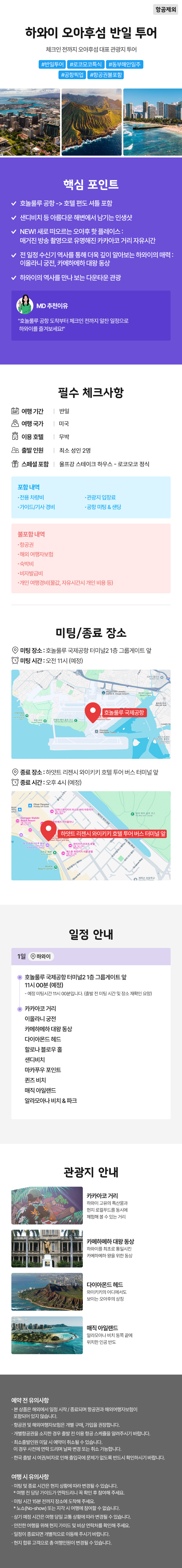 홀린듯 떠나온 하와이, 아름답고 기억에 남을 스팟을 선별해 짧지만 꽉찬 일정을 선보입니다. 호텔 체크인전까지 한국인 가이드와 함께 알차게 즐겨보세요