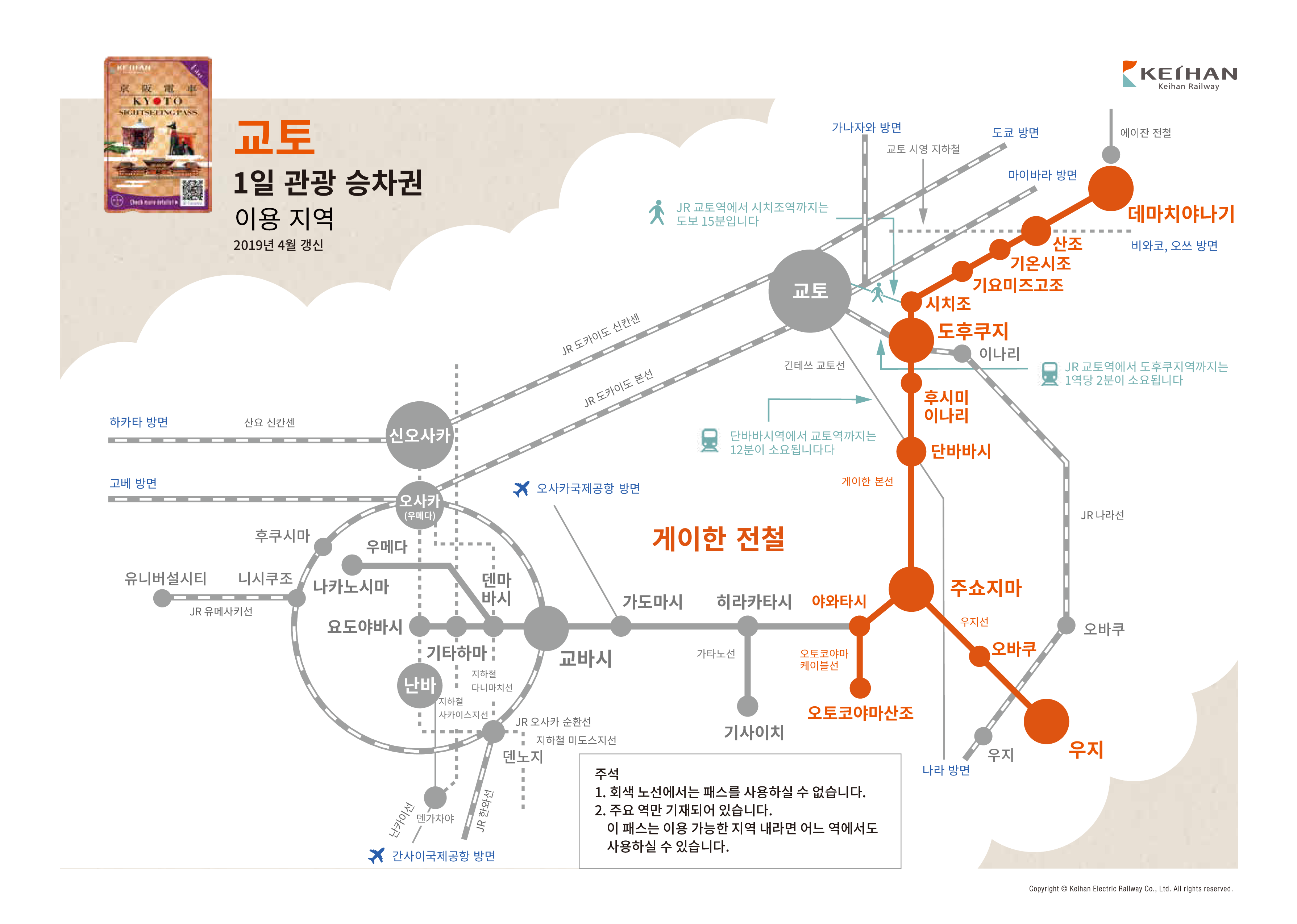 오사카 혹은 교토를 자유롭게 여행할 생각이라면 게이한 패스로 비용을 절약해보세요. 게이한 패스는 도쿄 메트로패스와 같이 오사카와 교토의 주요 여행지를 이동하는 게이한 본선을 자유롭게 이용할 수 있는 패스로, 게이한 패스 하나면 교토는 물론 교바시, 가도마시, 주쇼지마, 우시 그리고 도후쿠지와 같은 다양한 여행지를 편하게 둘러볼 수 있어요.