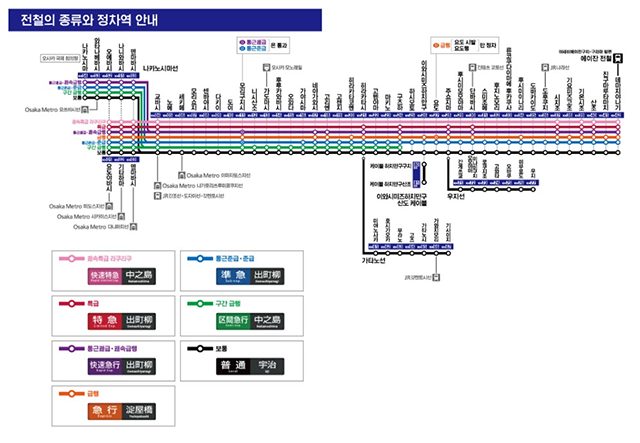 위의 지도에 표시된 지역에서는 무제한 이용할 수 있는 패스가 바로 교토 - 오사카 게이한 패스예요. 노선은 생각보다 간단하기 때문에 이 정도를 보면 될 것 같고, 아래에는 이용 가능한 전철 등급을 소개할게요.