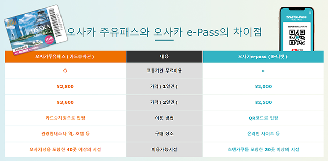 쉽게 한 줄로 정리하면 오사카 주유패스는 '교통 + 명소 입장권' / 오사카 e-Pass는 '주요 명소 전용 입장권이에요. 오사카 e패스는 주유패스와 비슷하지만 큰 차이점이 있어요. 바로 교통권이 없다는 것이에요. 즉, 오사카 유명 명소 입장에 초점을 맞춘 실속형 패키지권이에요.