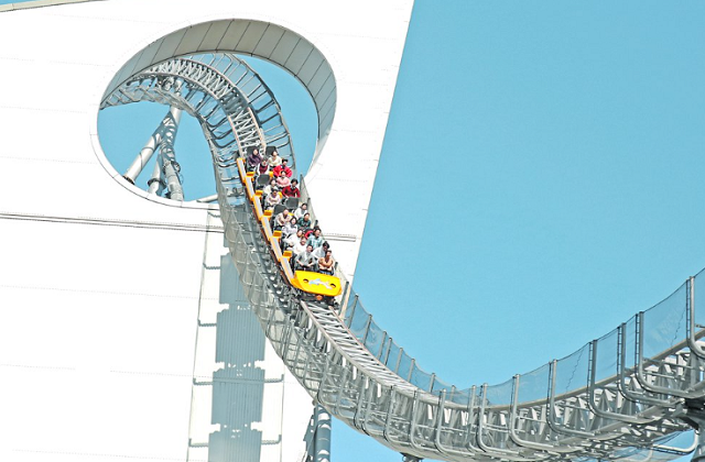 도시 빌딩 숲을 달려오는 질주감! 라쿠아의 벽과 빋오 한 가운데롤 통과하는 스피드 있는 코스터
