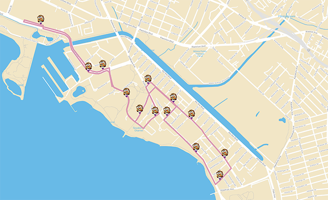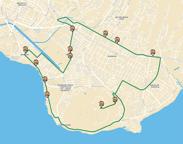 와이키키 쇼핑 플라자▶듀크 카하나모쿠 동상▶애스턴 와이키키비치 호텔▶힐튼 와이키키 비치 호텔▶마루가메 우동▶코트야드 메리어트▶호텔 라 크로익스▶호쿠라니 호텔▶아쿠아 팜스 와이키키▶알라모아나 센터▶일리카이 호텔▶할레 코아 호텔▶트럼프 국제 호텔